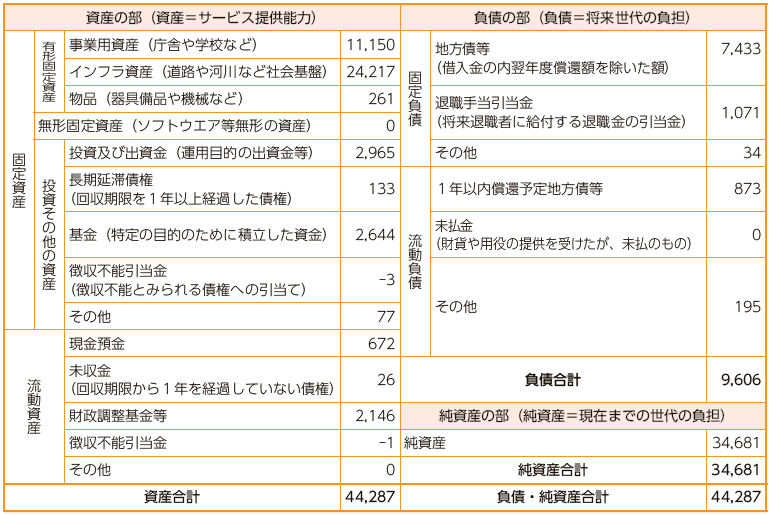 上の表は、4つの財務諸表の内の一つである「貸借対照表」です。町が所有している資産や、これから返済していかなければならない地方債などの負債がどれくらいあるのかを確認することができます。