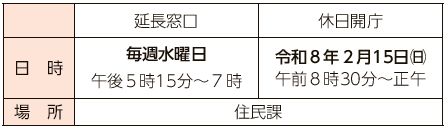 ◎延長窓口・休日開庁とも、住民課への電話予約が必要です。