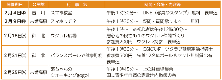 2月の公民館主催行事をお知らせします。