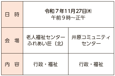 行政・人権・福祉相談(心配ごと相談)を次の2会場で行います。相談は無料です。秘密は固く守られますので、安心してお気軽にご相談ください。