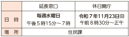◎延長窓口・休日開庁とも、住民課への電話予約が必要です。