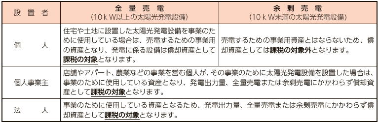 家屋の屋根および土地に太陽光発電設備を設置して売電する場合、個人住宅用の余剰売電設備(下表課税区分参照)を除き、固定資産税(償却資産)の課税対象となります。