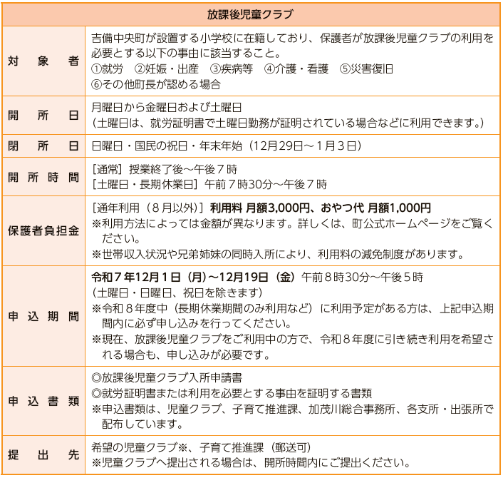 令和8年度に放課後児童クラブの利用を希望される児童を募集しますので、入所を希望する児童の保護者は、申込期間内に書類を提出してください。