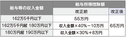 給与等の収入金額が190万円以下の場合は、次のとおり、給与所得控除額が引き上げられます。