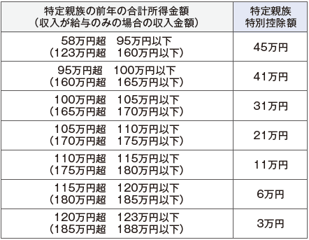 生計を一にする19歳以上23歳未満の親族(配偶者、青色事業専従者及び白色事業専従者を除く。)のうち、前年の合計所得金額が58万円超123万円以下の特定親族を有する場合に所得控除の適用が受けられます。
