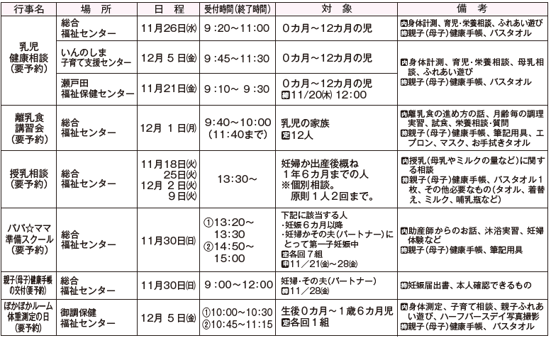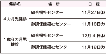 健診日の1週間前までに通知が届かない場合は、ご連絡ください。なるべく住所地区のセンターで受診してください。年間日程・対象者については市HPをご覧ください。
