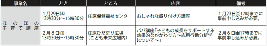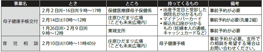 子育て 子育て世代包括支援センター事業・母子保健事業 18/36 前の記事 次の記事 発行日 : 2026年01月06日 自治体名 : 広島県庄原市 広報紙名 : 広報しょうばら 2026年1月号(No.250) 子育て世代包括支援センター事業 問合せ:ほのぼのネット 【電話】0824-73-1214 母子保健事業 問合せ:保健医療課母子保健係 【電話】0824-73-1214 Tweet シェアする あなたの相談をお受けします Information お知らせー催しー