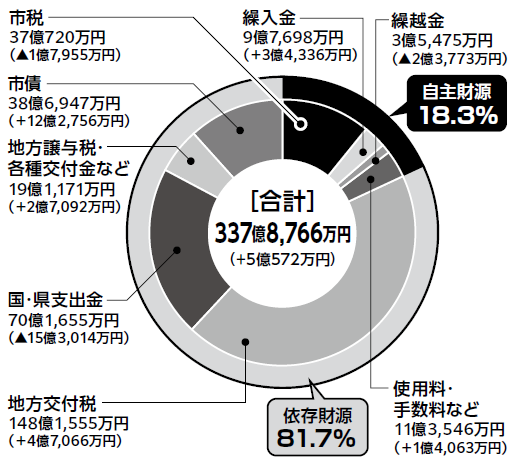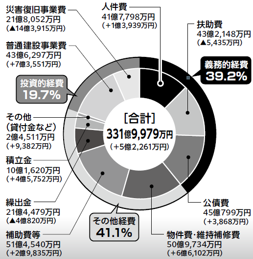 また、本市の最重要課題である人口減少対策など、各種事業を着実に進めた結果、歳出が331億9,979万円(前年度比5億2,261万円増)となった一方、歳入は、普通交付税の追加交付による地方交付税の増額などに伴い、337億8,766万円(前年度比5億572万円増)となり、いずれも前年度より増額となりました。