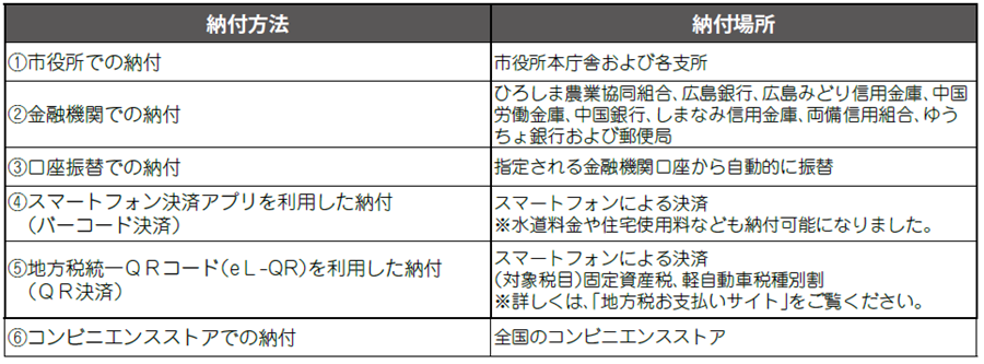 市税などの納付には、市から送付する納付書を使って市役所、金融機関の窓口やコンビニなどで納付する方法のほかに、口座振替、スマホアプリや二次元コードを利用した納付方法があります。納付者ご自身に適した方法により、期限までの納付にご協力ください。