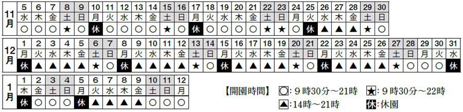 「ウインターイルミネーション2025-2026 備北イルミ」期間中 開園時間カレンダー