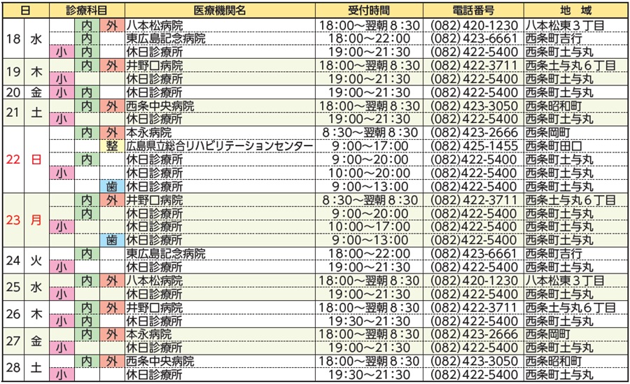 内科・小児科:竹原市休日診療所(竹原市保健センター内) 9:00~12:00 13:00~16:00【電話】(0846)22-7157