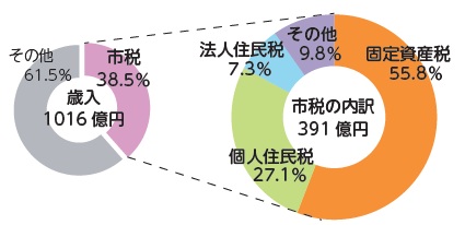 毎年11月11〜17日は税を考える週間です。皆さんが納める市税は、市の歳入(入ってくるお金)のうちの38.5%を占めています。残り61.5%は地方交付税や国庫・県支出金など国や県からの補助金です。
