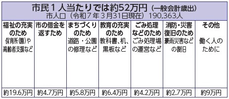 市民1人当たりの市税の負担は、約21万円(歳入における市税の金額を令和7年3月現在の人口で割った数字)。市民1人当たりの行政サービスに必要な歳出(出ていくお金)は約52万円です。