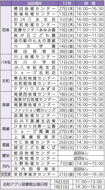 休館日:毎週月曜日、7日(金)、祝休日。ただし、中央図書館は3日(月・祝)、23日(日・祝)は開館、4日(火)は休館。高屋図書館は毎週日曜日、祝休日は休館。