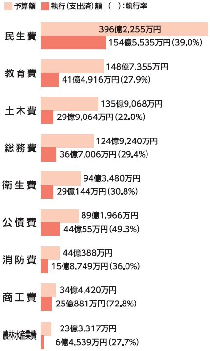 扶助費(私立保育所等給付費、児童手当等)および普通建設事業費(西高屋駅自由通路等および小学校施設整備等)などの増により、前年度と比較して歳出全体が増加しました。