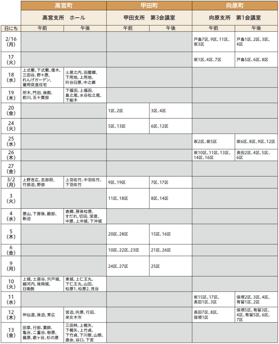 下記日程で申告に関する相談を受け付けます。自身の所在地が記載されている日時に指定会場へ来場してください。