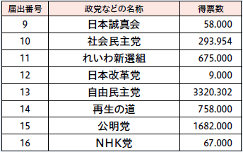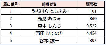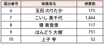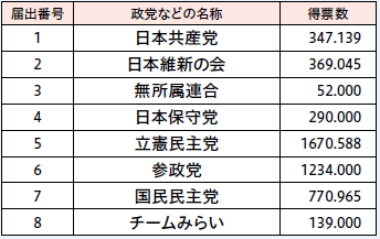 案分…同一の略称の名簿届出政党等や、同一の氏名・氏または名の候補者が複数いる場合に、その略称や氏名・氏または名のみを記載した投票を、それぞれの候補者等の得票数の割合に応じて分け合っているため、得票数に小数点以下の数値があります。