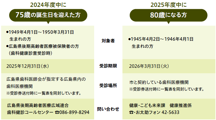 高齢者の口腔(こうくう)機能の低下や肺炎などの予防を図るための歯科健康診査を行います。対象の方には、受診券を送付していますので、歯科医療機関へ直接申し込んでください。お口の健康は、全身の健康につながります。この機会に受診しましょう。