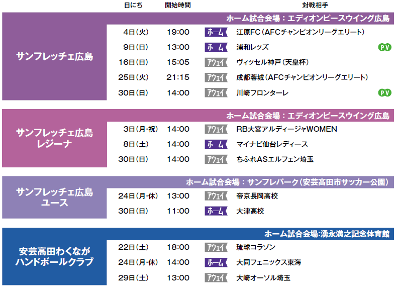 スポーツ 安芸高田市ゆかりのスポーツチームを応援しよう!11月の試合日程 2/32 前の記事 次の記事 発行日 : 2025年10月23日 自治体名 : 広島県安芸高田市 広報紙名 : 広報あきたかた 令和7年11月号 〔道の駅「三矢の里あきたかた」でのパブリックビューイング[J1リーグ全38試合を放映]〕 ※10月3日(金)時点の日程です。 Tweet シェアする イベント情報 11月のスマートフォン教室・相談会