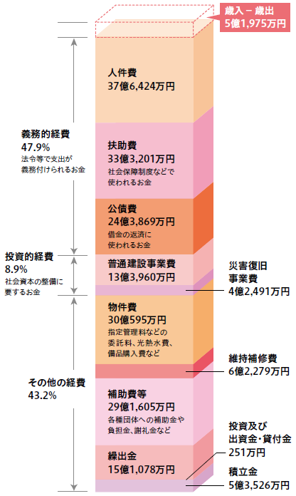 ・「人事院勧告に準じた人件費の増加」や「小中学校の給食費無償化による扶助費の増加」などで経常的な支出が約9千万円増加