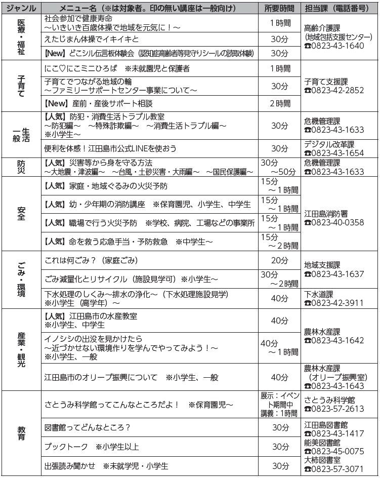 料金・会場:職員の派遣料は無料です。会場の手配や準備、会場借り上げなどの費用は、申込者の負担となります。なお、会場は江田島市内に限ります(個人住宅は不可)。