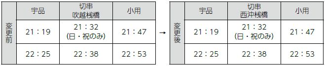 切串西沖桟橋予備桟橋の故障により、現在吹越桟橋に寄港しています宇品発切串経由小用港の夜間便は、予備桟橋が修復されるので、西沖桟橋への寄港に変更となります。