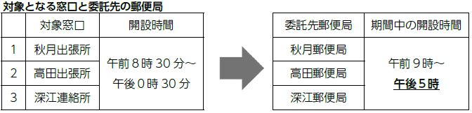 市では、窓口業務の効率化と住民サービスの向上を図るため、市内3つの出張所・連絡所について、窓口業務を最寄りの郵便局へ試験的に委託し、今後の継続的な委託の可能性や新たなサービス提供による窓口利用者数について検証します。