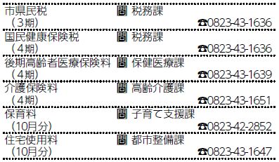 くらし 市税などの納期限 口座振替日10月31日(木) 43/47 前の記事 次の記事 記事を読み上げる 発行日 : 2025年10月01日 自治体名 : 広島県江田島市 広報紙名 : 広報えたじま 第252号(令和7年10月号) 税などは、期限内に納めましょう。ゆめタウン江田島内の市民サービスセンターでは、土曜日・日曜日・祝日でも納付できます。 Tweet シェアする 10月の相談 令和7年8月31日現在 人口と世帯数(外国人市民を含む)