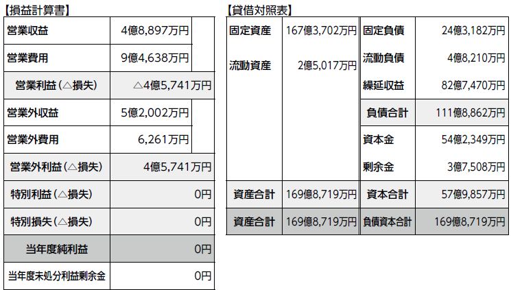 損益計算書の当年度純利益は0円で、当年度未処分利益剰余金は0円となりました。貸借対照表の資産合計・負債資本合計はそれぞれ169億8,719万円です。