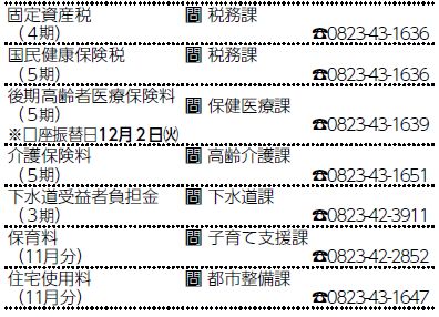 くらし 市税などの納期限 口座振替日12月1日(月) 43/48 前の記事 次の記事 記事を読み上げる 発行日 : 2025年11月01日 自治体名 : 広島県江田島市 広報紙名 : 広報えたじま 第253号(令和7年11月号) 税などは、期限内に納めましょう。ゆめタウン江田島内の市民サービスセンターでは、土曜日・日曜日・祝日でも納付できます。 Tweet シェアする 11月の相談 ありがとうございました 寄附(敬称略)