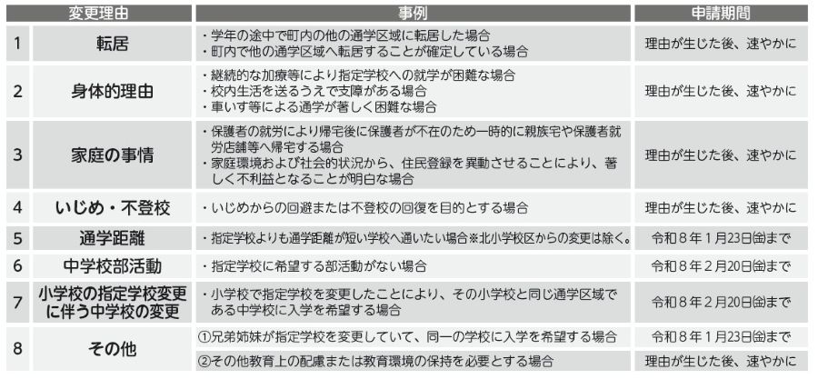 次の表にある変更理由に当てはまる場合は、通学区域で指定された学校を変更することができます。指定学校の変更を希望する場合は、学校教育課にご相談ください。なお、変更が認められる期間は、小・中学校卒業までの保護者が希望する期間です。変更理由5・6は、各学校の学級数や教室数などにより児童生徒数の適正規模の範囲内で認めます。