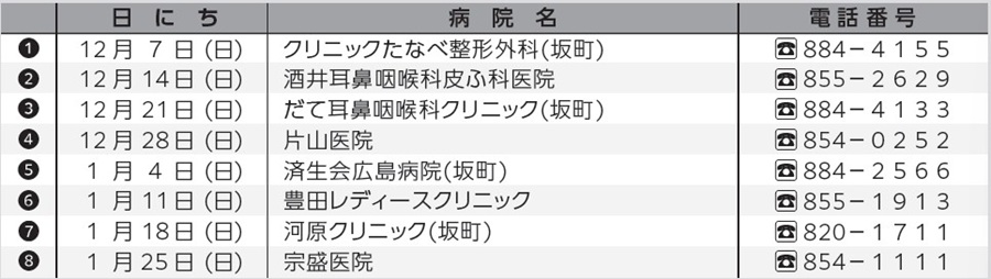「こども医療でんわ相談」#8000または【電話】082-555-8870(月~金曜日19:00~翌朝8:00、土日祝・年末年始(12月29日~1月3日)17:00~翌朝8:00)