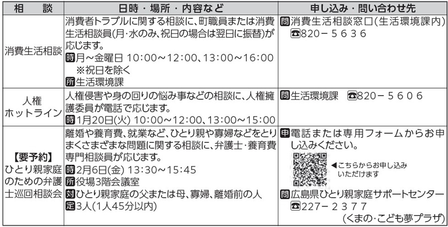 くらし 暮らしの情報 相談~秘密保持を厳守しますので、気軽にご相談ください~ 20/31 前の記事 次の記事 発行日 : 2026年01月01日 自治体名 : 広島県熊野町 広報紙名 : 広報くまの 2026年1月号 ■各種相談窓口をご利用ください Tweet シェアする 筆の里工房 暮らしの情報 講座・イベント