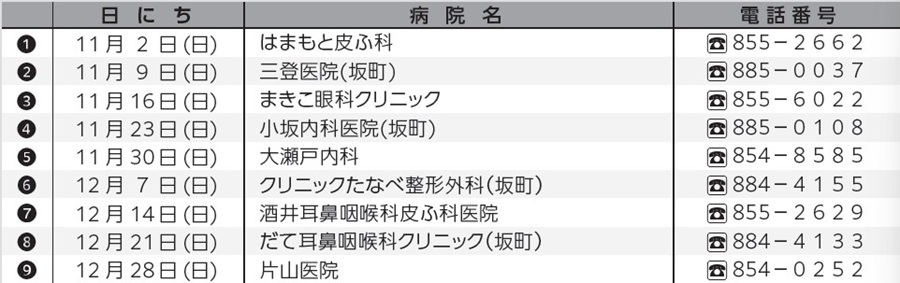 ○急な当番医の変更があった場合は、記載と異なることがありますので、ご了承ください。
