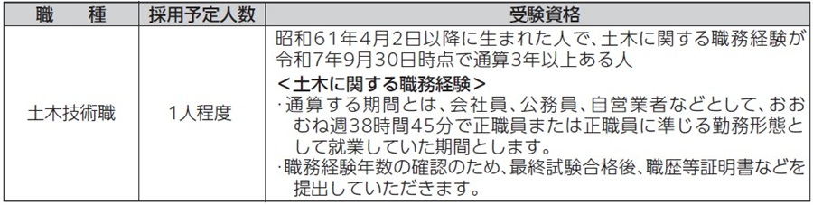 広島県市町合同職員採用試験において、令和8年4月1日採用の社会人経験のある土木技術職員を募集します。詳細は、広島県ホームページまたは町ホームページをご覧ください。