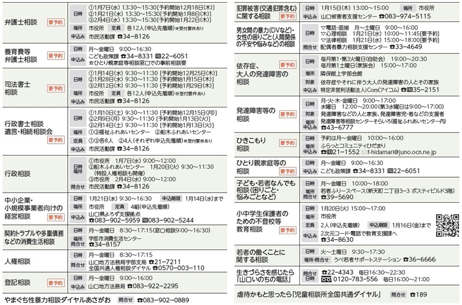 くらし 無料相談 22/34 前の記事 次の記事 発行日 : 2026年01月01日 自治体名 : 山口県宇部市 広報紙名 : 広報うべ 令和8年1月号 電話相談は、場合によりつながりにくいことがあります。しばらくしてから、おかけ直しください。 Tweet シェアする 休日・夜間救急診療所 診療日 市役所開庁時間