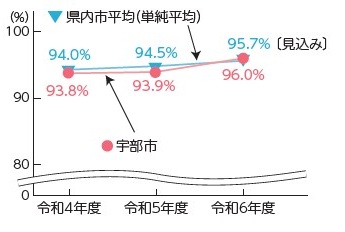 財政の弾力性を測る目安とされる「経常収支比率」については、96.0%と、前年度より2.1ポイント上昇しています。