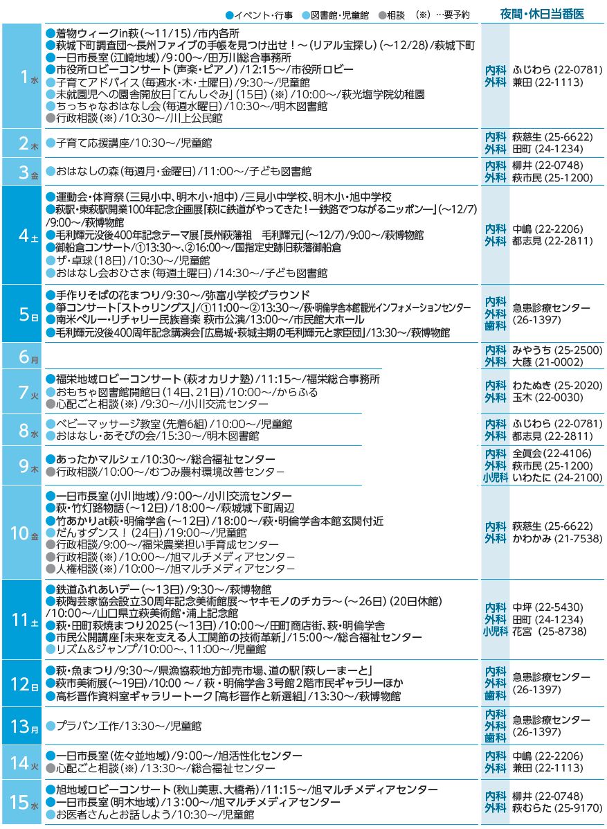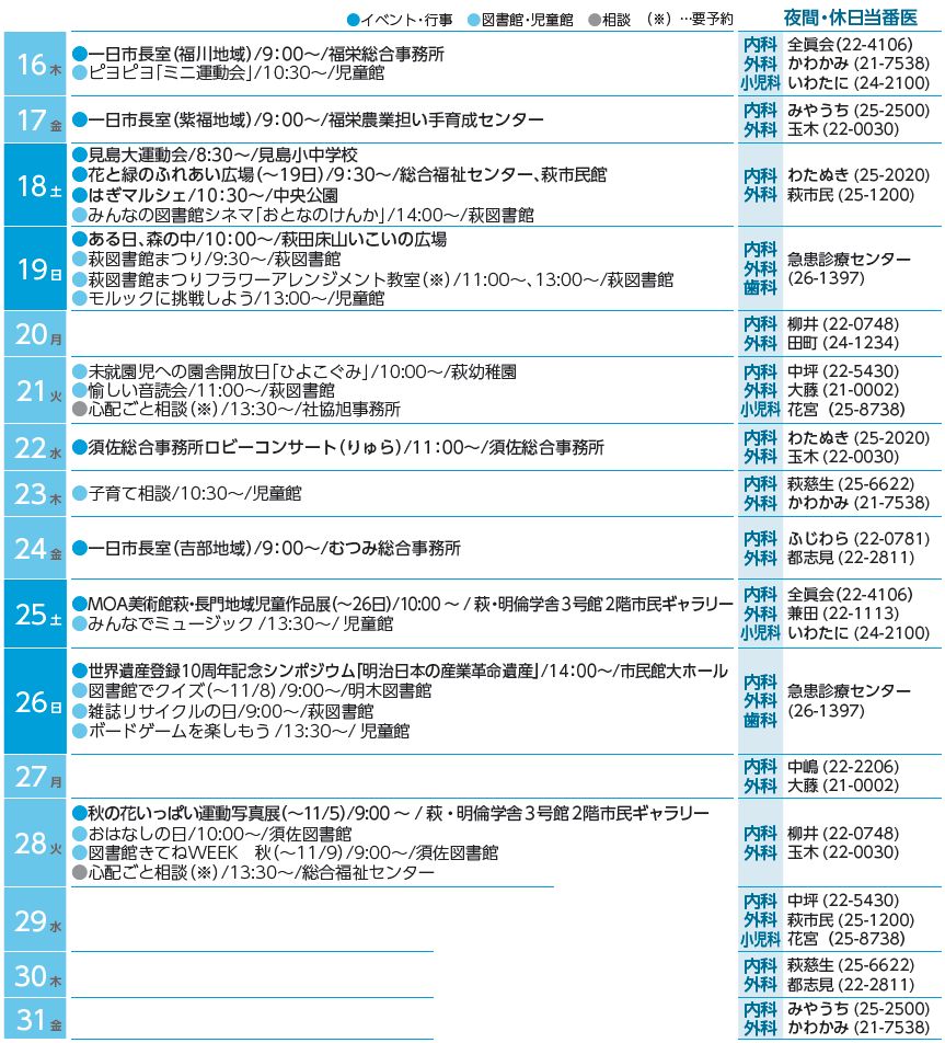 くらし 10月情報カレンダー 18/28 前の記事 次の記事 発行日 : 2025年10月01日 自治体名 : 山口県萩市 広報紙名 : 広報はぎ 2025年10月号 萩図書館行事については、人数制限等がある場合があります。詳細は、萩図書館【電話】25-6355までお問い合わせください。 Tweet シェアする ふれ愛ギャラリー萩ぶらっと(萩・明倫学舎3号館2階) 当番医が変わった場合