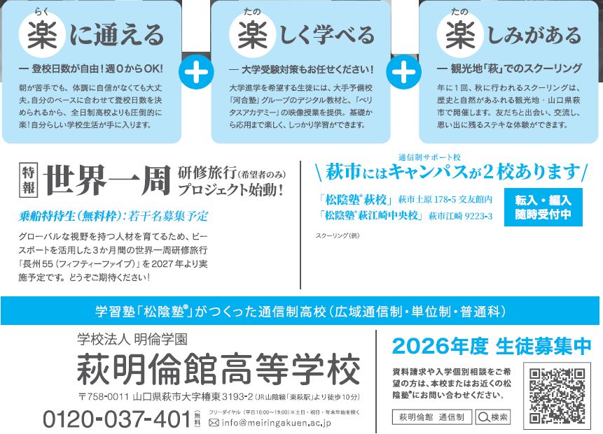 子育て シリーズ魅力ある高校紹介2025No.4 12/42 前の記事 次の記事 発行日 : 2025年10月15日 自治体名 : 山口県萩市 広報紙名 : 広報はぎ 2025年10月15日号 自由な投稿日数で通学が圧倒的に楽! 萩で初めての通信制高校がついに誕生! 最高だね♪ Tweet シェアする 募集/萩市過疎地域持続的発展計画(案)のパブリックコメント 情報案内板ーお知らせー