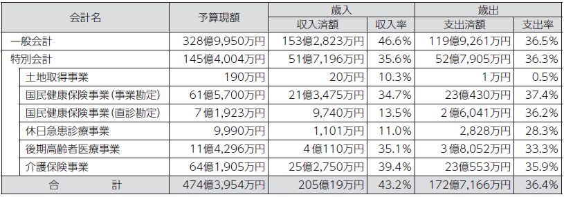 9月末現在における収支状況は、収入済額153億2,823万円で執行率46.6%、支出済額119億9,261万円で執行率36.5%です。