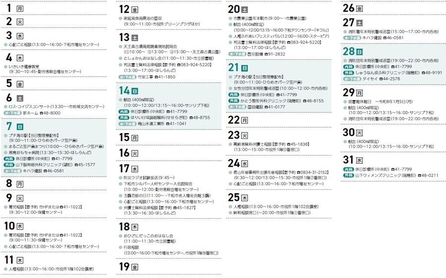 ●いきいき健康教室、下松市シルバー人材センター入会説明会については勤労者総合福祉センター(【電話】44-8200)へ、心配ごと相談、行政相談については下松市福祉センター(【電話】41-2242)へお問い合わせください。