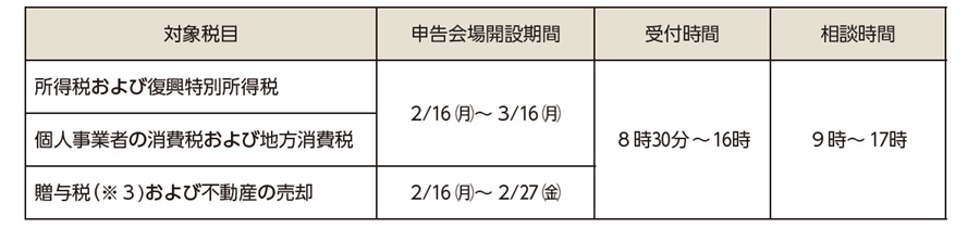 ※3 申告期間が2/2(月)から始まる贈与税についても、申告会場で申告できるのは2/16(月)からです