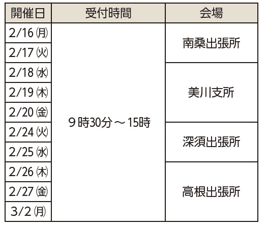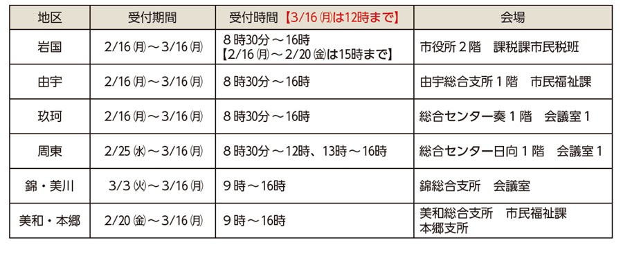 各総合支所、支所で申告する人は広報いわくに2月1日号と同時配布する「市・県民税の申告について」で詳細を確認してください。(玖珂は12月26日発行の地域版「今月のお知らせ」でも確認できます)