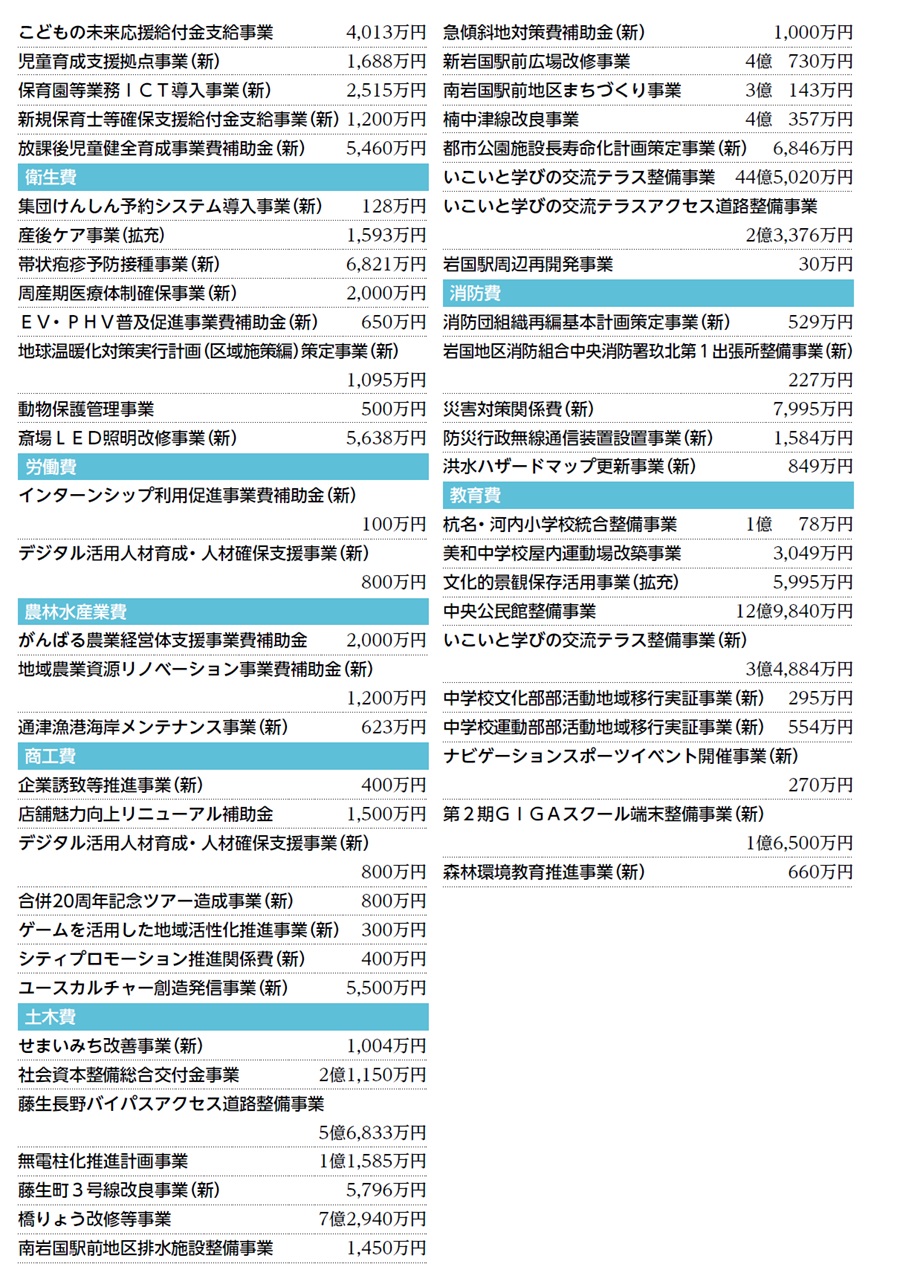 くらし 令和7年度 主要な事業 7/38 前の記事 次の記事 発行日 : 2025年04月15日 自治体名 : 山口県岩国市 広報紙名 : 広報いわくに 令和7年4月15日号 市が行う主要な事業と予算額を紹介します。 (〇印は事業の主な内訳を再掲したもの) 問合せ:財政課 【電話】29-5050 Tweet シェアする 令和7年度 岩国市の予算 岩国市合併20周年記念 第47回錦帯橋まつり