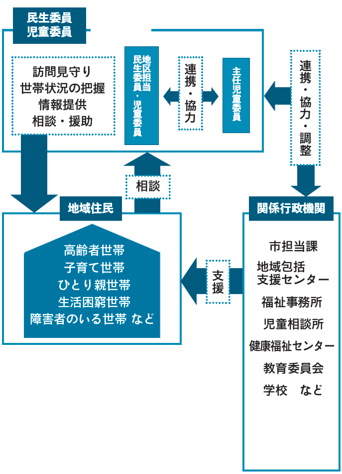民生委員・児童委員は、厚生労働大臣から委嘱された非常勤特別職の地方公務員で、地域に暮らす「市民の最も身近な相談相手」です。