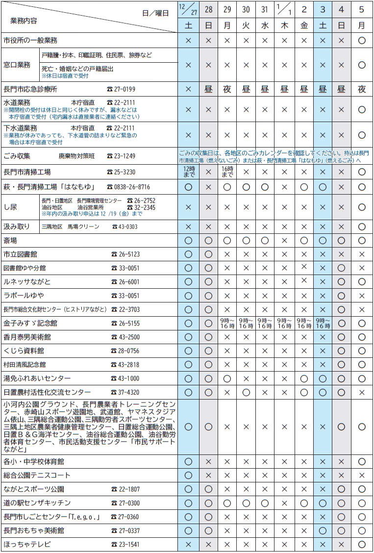 くらし 年末年始の業務 11/27 前の記事 次の記事 発行日 : 2025年12月01日 自治体名 : 山口県長門市 広報紙名 : 長門市広報 知っちょこ 令和7年12月号 ○通常 △午前のみ ▽午後のみ ×休み 昼9:00〜17:00 夜19:00〜22:00 ※受付時間は、昼の午前は11:30まで・午後は16:30まで、夜は21:30まで Tweet シェアする 暮らしの知っちょこ お知らせ(2) 暮らしの知っちょこ 募集