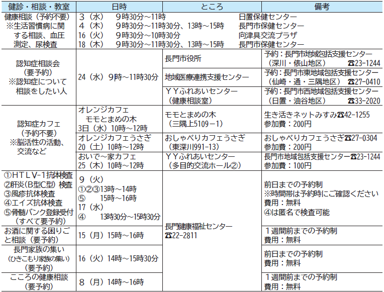 健康 12月の予定表 健康に関する相談 23/27 前の記事 次の記事 発行日 : 2025年12月01日 自治体名 : 山口県長門市 広報紙名 : 長門市広報 知っちょこ 令和7年12月号 ※掲載している情報は11月13日時点のもので、イベントなどは中止・延期となることがあります ■乳幼児健診・相談・教室 ■成人対象 Tweet シェアする 12月の予定表 相談/納期限 知っちょコラム