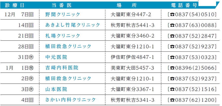 くらし 12月・年始の日曜休日当番医 16/30 前の記事 次の記事 発行日 : 2025年12月01日 自治体名 : 山口県美祢市 広報紙名 : 広報げんきみね。 2025年12月1日 No261 診療時間 9:00~17:00 ※当番医は変更になっている場合があります。電話で確認をしてから受診するようお願いします。 Tweet シェアする 12月・保健だより 消費生活センターだより Vol.91