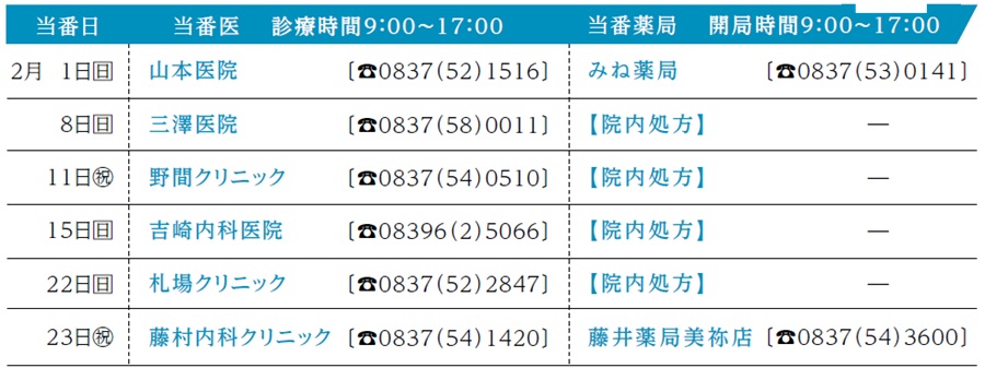 くらし 2月の日曜休日当番医・当番薬局 16/29 前の記事 次の記事 発行日 : 2026年02月01日 自治体名 : 山口県美祢市 広報紙名 : 広報げんきみね。 2026年2月1日 No263 ※当番医・当番薬局は変更になっている場合があります。電話で確認をしてから受診・来局するようお願いします。 Tweet シェアする 2月・保健だより 消費生活センターだより Vol.93