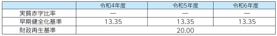 地方公共団体の標準財政規模(標準的な収入額を示す数値)に対する一般会計等(普通会計)の実質赤字の比率であり、赤字の深刻度を表しています。令和6年度の一般会計、環境衛生事業特別会計の実質収支の合計は黒字であり、実質赤字比率は該当せず、財政の健全性を表しています。